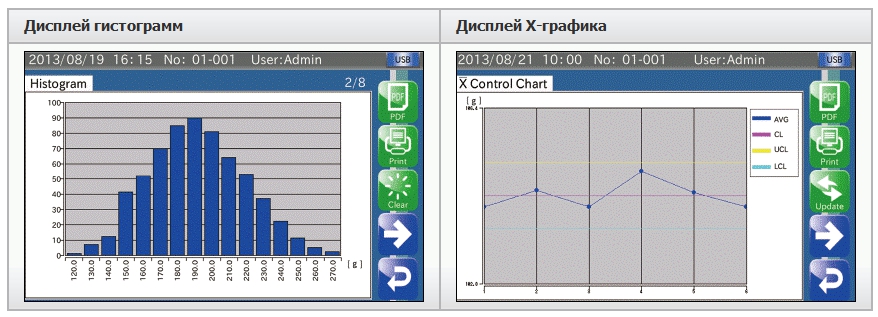 Также предусмотрена возможность вывода гистограмм, контрольных графиков и отчетов на карту памяти USB в формате PDF.