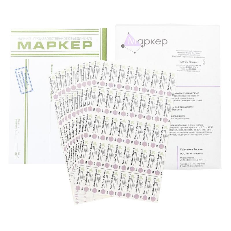 Многопеременный индикатор «ХимТест-Фарм-6», 4 класс для контроля параметров пар. стерил. для режима: 120С/30 мин. (500 шт.)